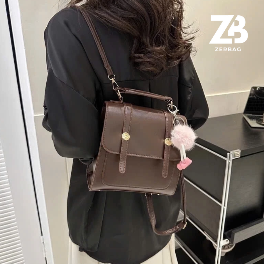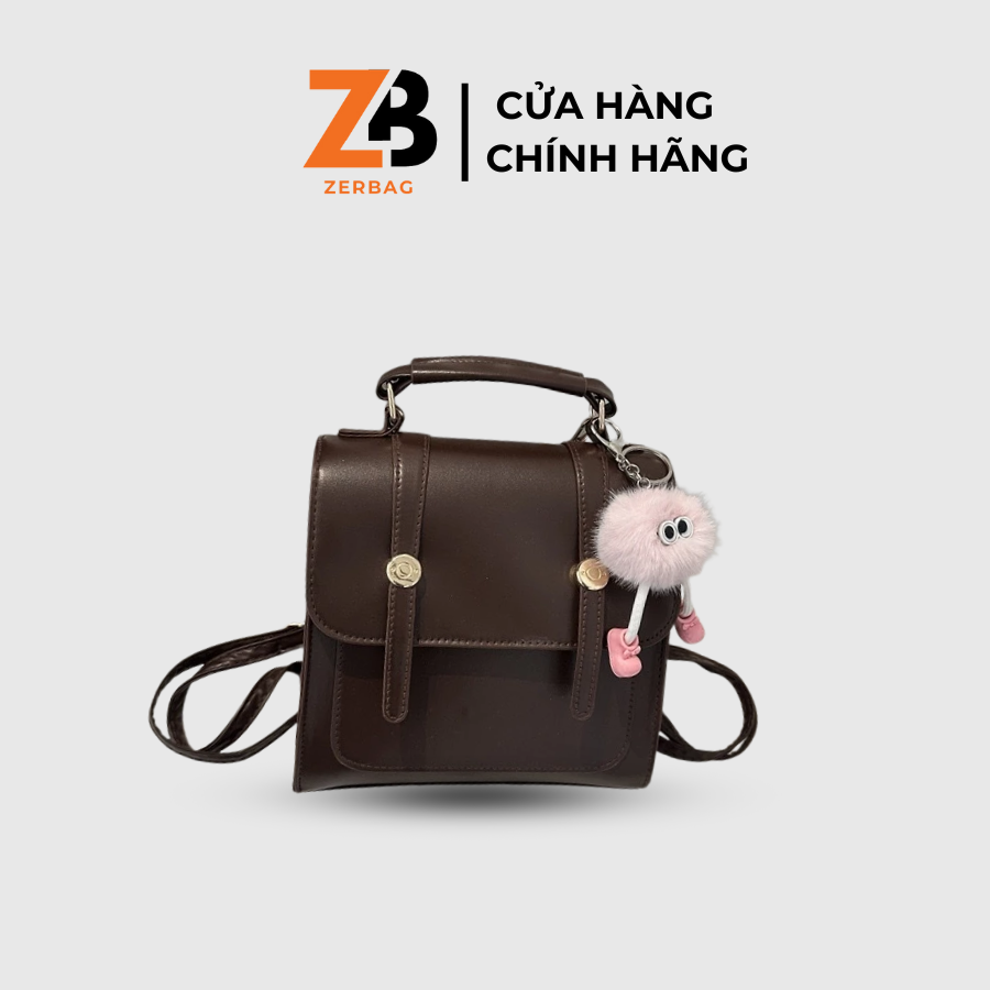 Balo da nữ ZERBAG mini hộp vuông da PU kèm charm bông dễ thương