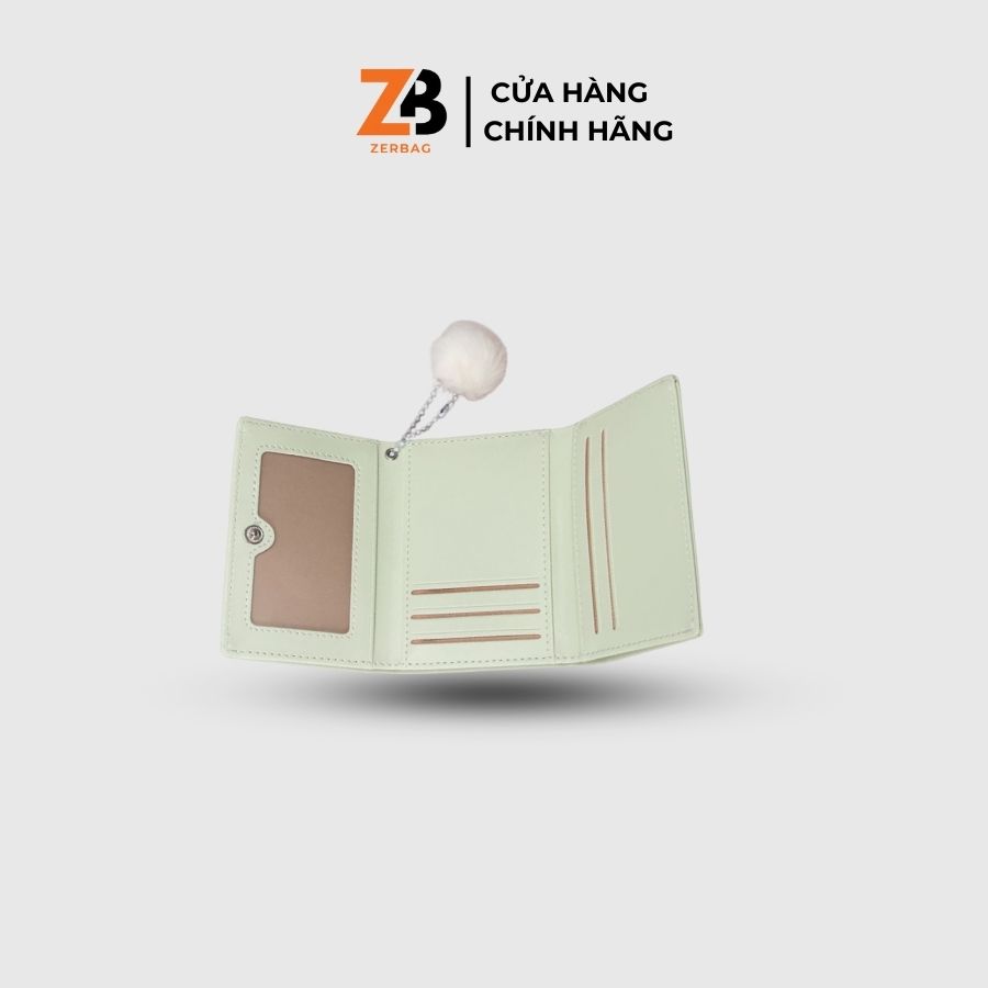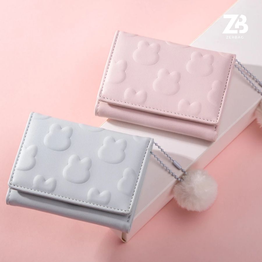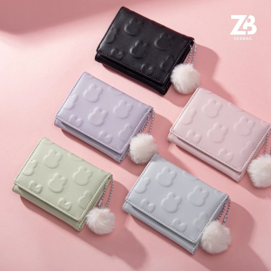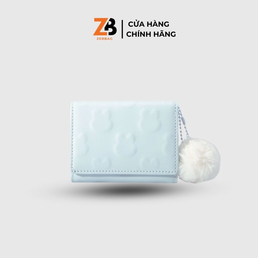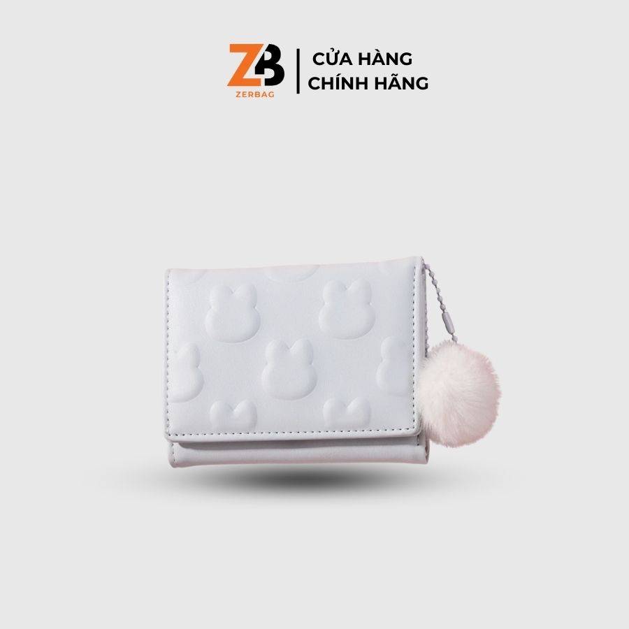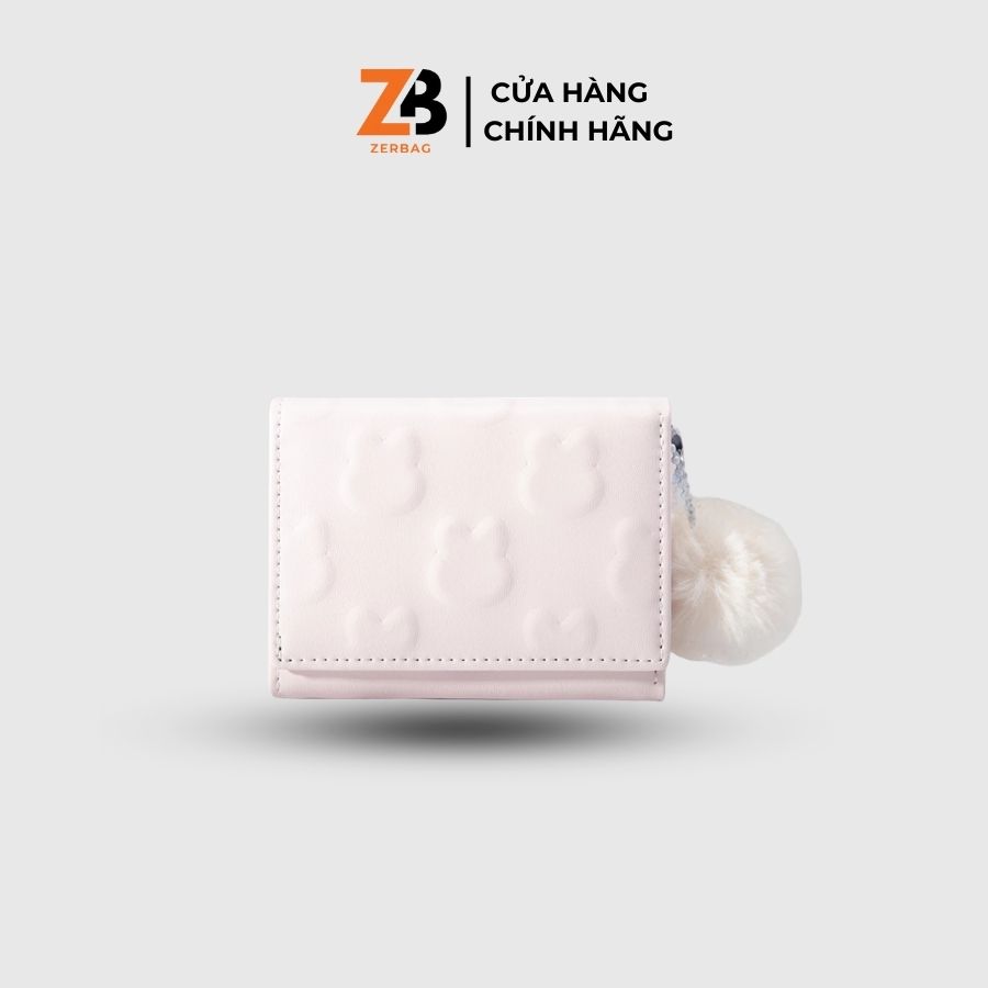 Ví nữ ngắn ZERBAG gập ba bằng da PU in họa tiết thỏ có mặt dây chuyền lông xù